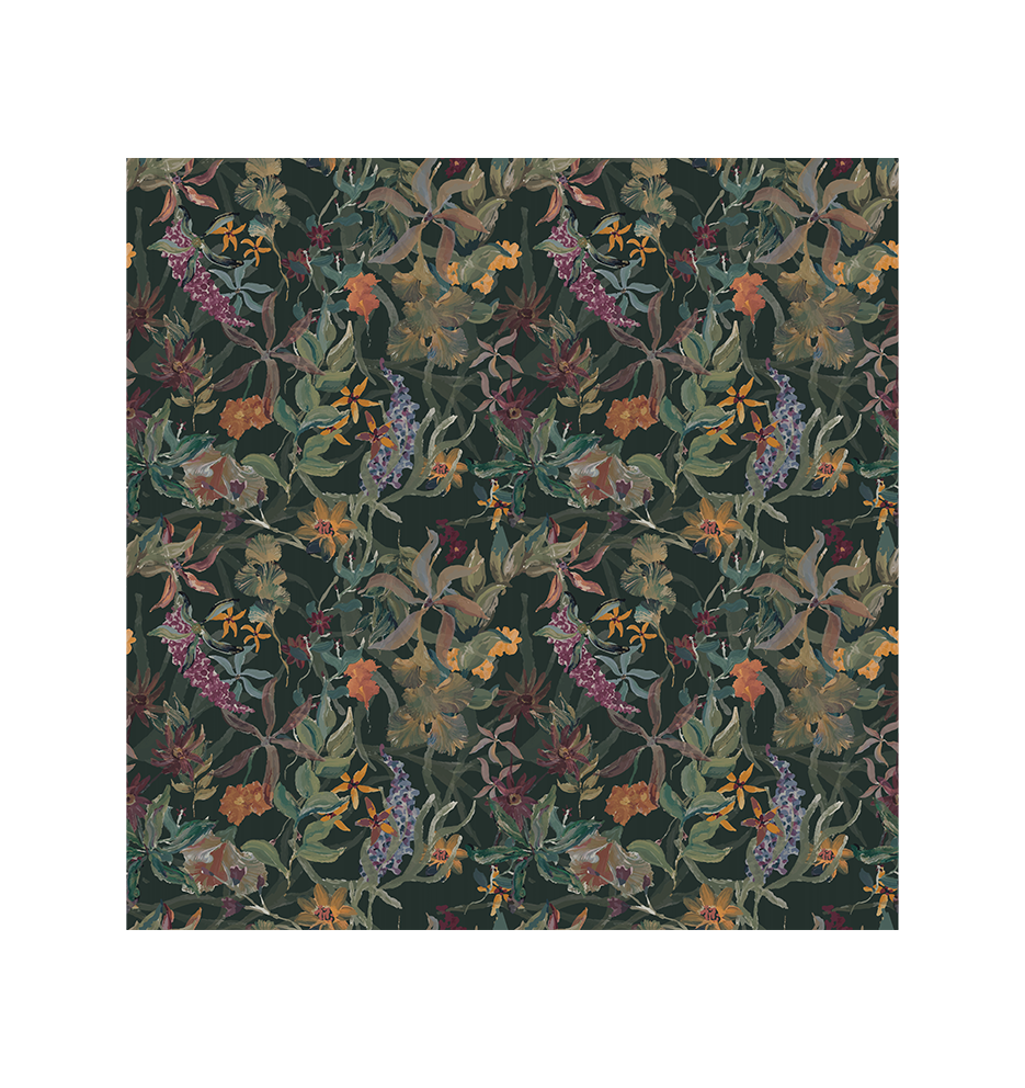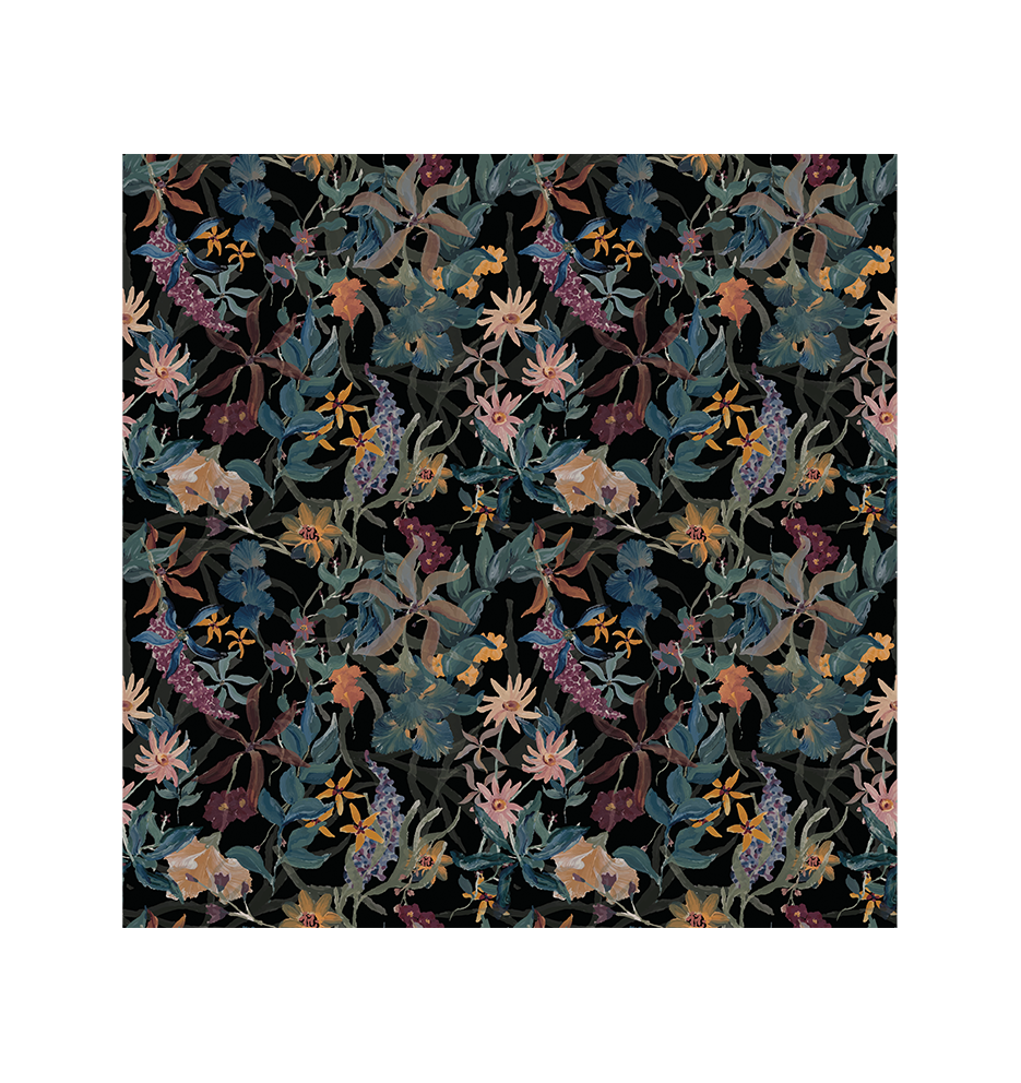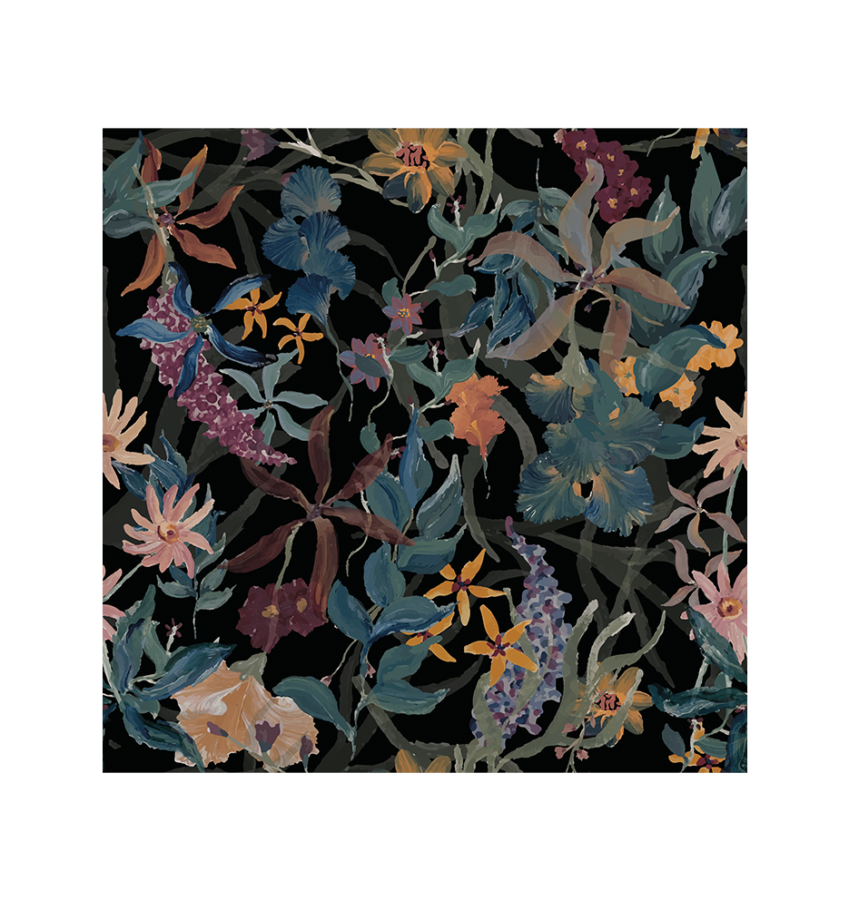 The Midnight Garden pattern and colorway were inspired by a moodboard and color palette that evoke a serene yet mysterious atmosphere. Made up of hand-painted elements, this design draws from deep, rich tones and contrasts to reflect the beauty of a garden at night, where shadows and colors come together in harmony. My interpretation captures the tranquility and intrigue of a midnight garden, blending dark hues with pops of soft, glowing accents.